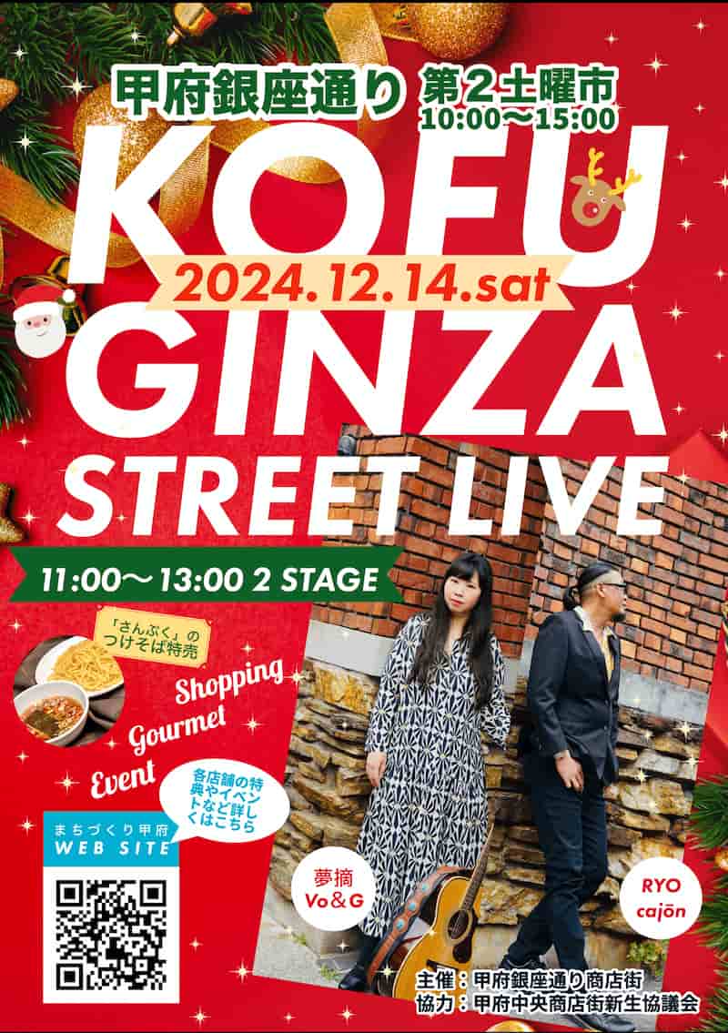 【ライブレポ】甲府銀座通りストリートライブ初回ありがとうございました! 2024年12月16日 最終更新日時 : 2025年1月21日 Mutsumi 2024.12.14 (Sat)甲府銀座通り商店街 第2土曜市&ストリートライブ 初回!寒い中みなさんに足を止めていただきありがとうございました!